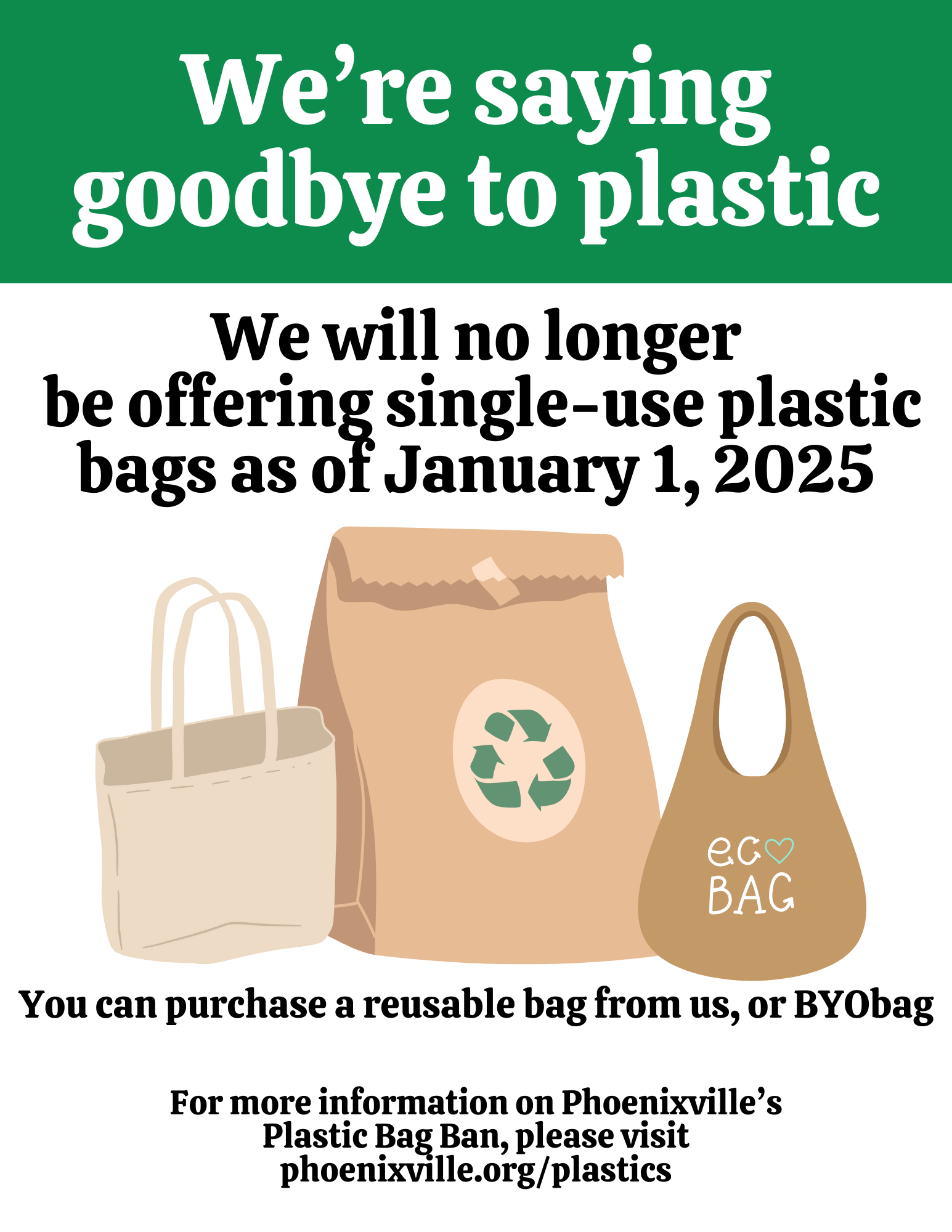 Beginning on January 1, 2025, commercial establishments in Phoenixville Borough are prohibited from providing single-use plastic carry out bags and non-compliant paper bags to customers.